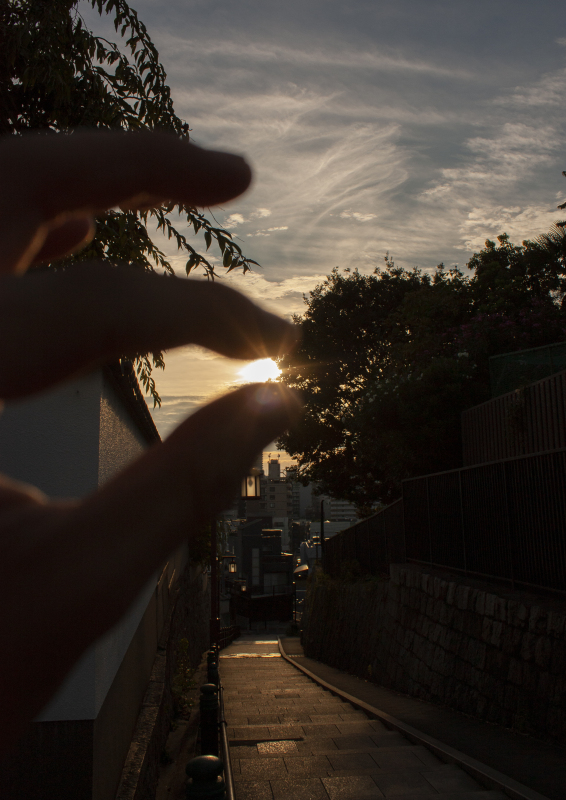 夕陽丘で夕日が一番キレイに撮れるのはどこかを探してみたら清水坂が一番キレイに撮れると思ったので、そこを選びました。ただ夕日を撮るだけでは、あまり面白くないので、夕日を摘んでいるような構図にして、面白い写真にしました。