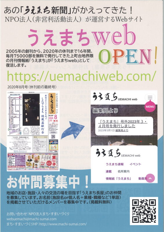 2005年の創刊から、2020年の休刊まで16年間、毎月7万5000部を無料で発行してきた上町台地界隈の月刊情報紙「うえまち」がうえまちwebとして復活しました。