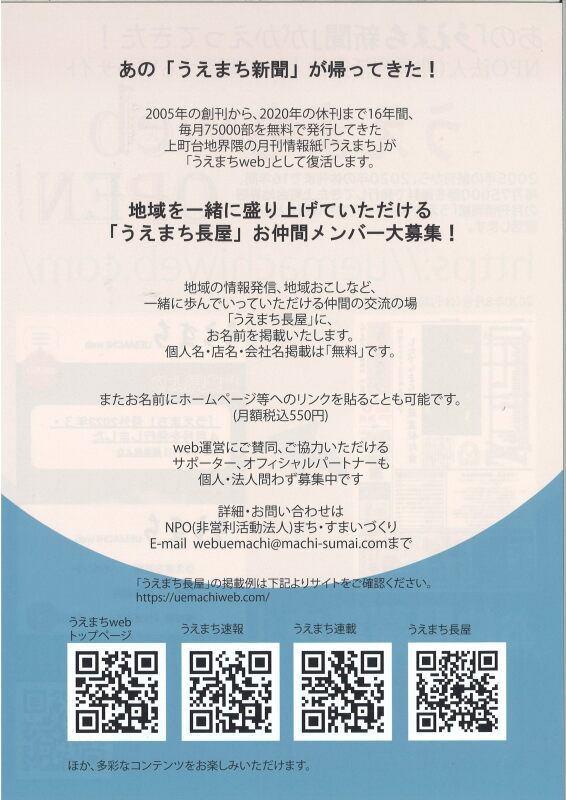 「うえまちweb」には地域の情報発信、地域興し、コミュニケーションと交流など、趣旨に賛同いただける方や、一緒に歩んでいっていただける仲間の集まりとして「うえまち長屋」をオープンします。