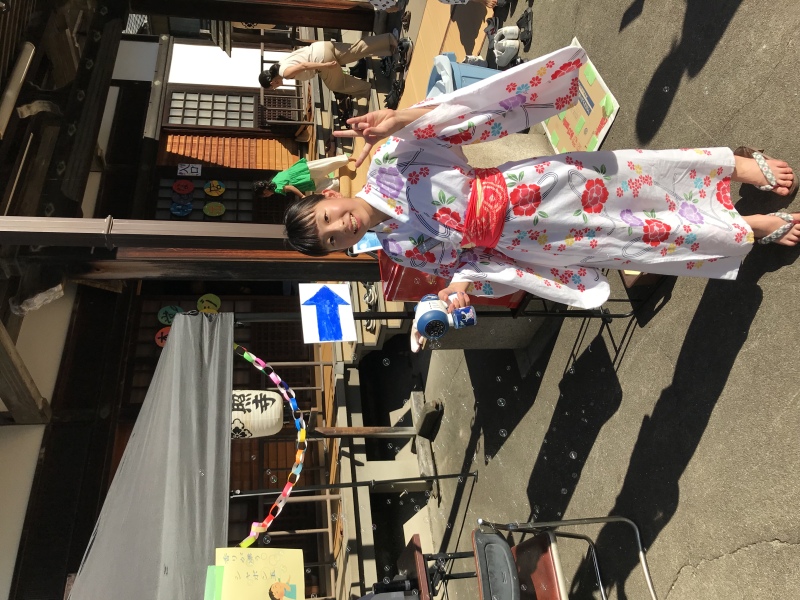 今枝由貴さん(小5)がシャボン玉実演のモデルをつとめてくれました。素敵なモデルさんです。飛んでいるシャボン玉が見えるでしょうか。