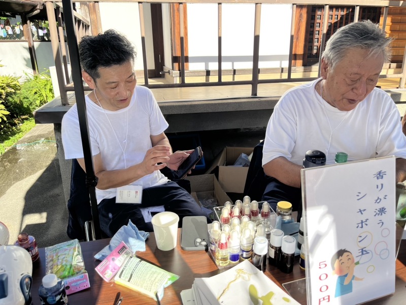 本堂前にはお香の「芳月苑」さん出店の「香り漂うシャボン玉」。