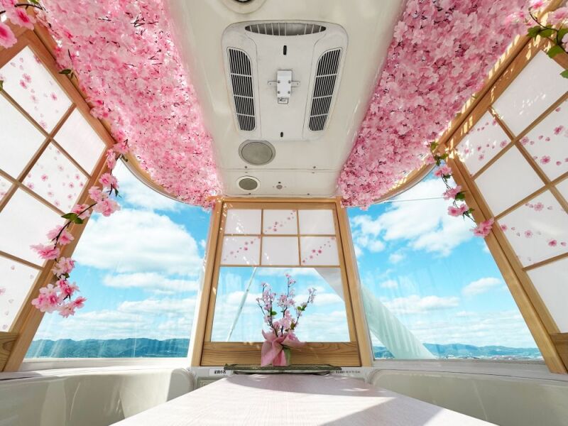 冷暖房完備、床面がシースルーで空中に浮遊している感覚が味わえて、素晴らしい眺望を楽しむことができる「OSAKA WHEEL:オオサカホイール(大阪府吹田市)」のゴンドラ内に、咲き誇る桜の演出が。