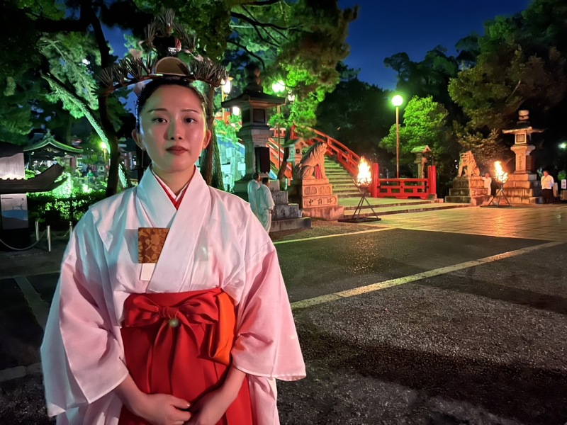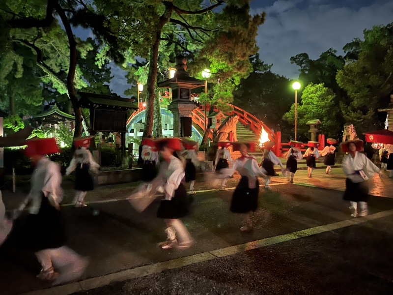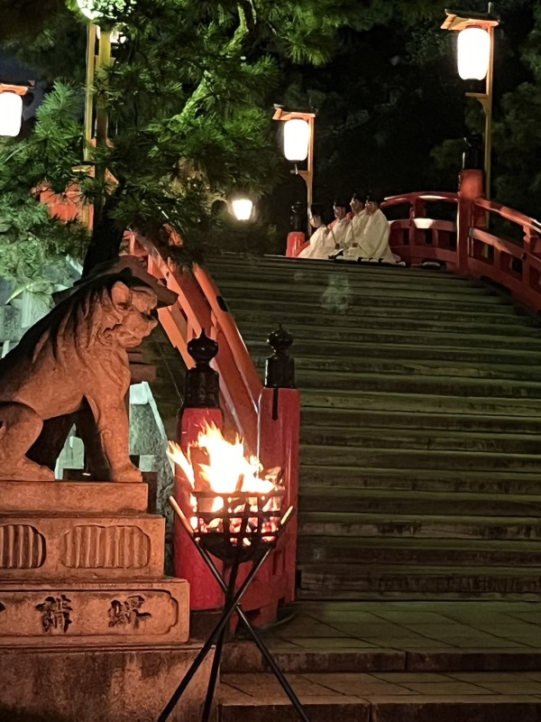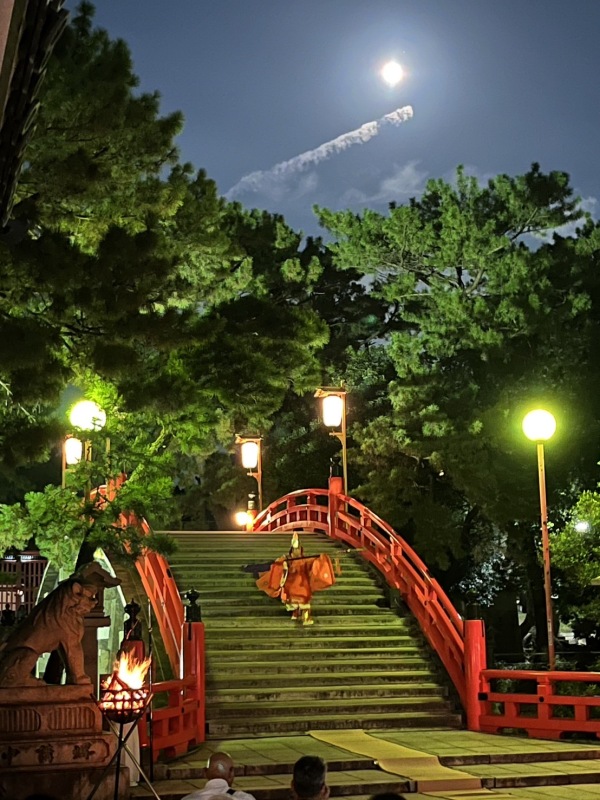 まず、奉告祭神事と全国から募った短歌・俳句献詠作品の表彰が第一本宮で本殿祭としておこなわれ、続いて豊臣秀吉の妻淀君(よどぎみ)奉納と伝えられている「反橋(そりはし・通称 太鼓橋)」前へ移動。この橋は川端康成の作品「反橋」で世界的に有名になりました。今日は反橋もライトアップされています。