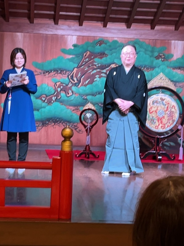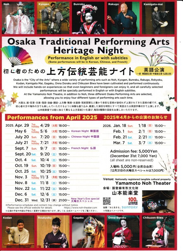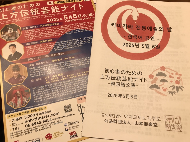 連休中の5月6日(火・祝)、中央区の山本能楽堂で、舞楽・落語・浪曲・能の韓国語や韓国語字幕による初心者のための公演が行われました。進行役の方による日本語・韓国語の案内に続き天王寺楽所雅亮会の方々による舞楽「蘇利古」、笑福亭銀平さんの韓国語落語、春野恵子さんの浪曲、最後に能「岩船」が披露されました。間には参観者二人の参加による小鼓演奏体験。初めて伝統芸能に接する観客もあり、国際理解の有益な場となっていました。山本能楽堂では今後も英語・中国語・仏語などでの公演が予定されています。上方伝統芸能に触れてみたい方はぜひ!