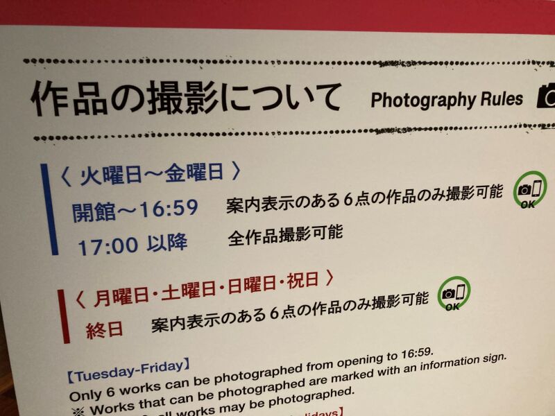 通常、美術館の展示物は撮影不可ですが、この展覧会では通常の時間でも6点が撮影可能、さらに特定の時間は全作品撮影可能なので、ぜひ、最後の写真をご確認ください。