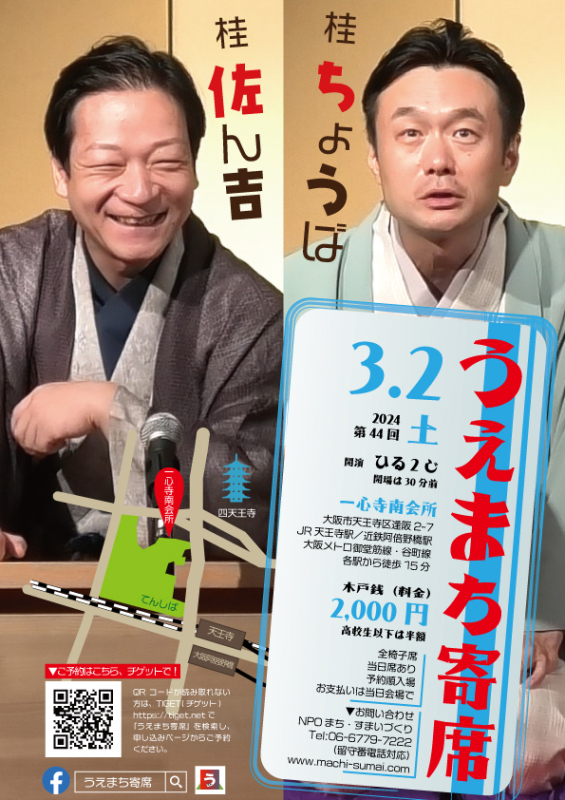 次回「第44回うえまち寄席」は、2024年3月2日土曜日、一心寺南会所で開催します。ぜひ、お運びくださいますようお願いいたします。
