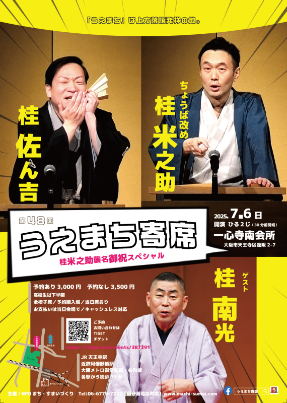 NPO法人まち・すまいづくりが主催する「うえまち寄席」。次回「第48回うえまち寄席」の開催は、2025年7月6日日曜に開催いたします。