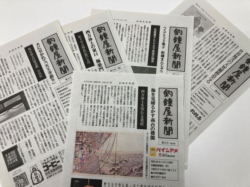 総本家釣鐘屋が「釣鐘屋新聞」を発行しています Posted on 2025年2月19日2025年2月19日 by うえまちウェブ編集者 「上町台地『名所図会』」の第47回でも紹介した総本家釣鐘屋では、「釣鐘屋新聞」を発行しています。創刊は令和5年5月。最新号は第6号で「四天王寺の五重塔」がテーマです。毎回、四天王寺やおまんじゅうのモチーフになった頌徳鐘などについて、トリビアな情報も交えて紹介しています。新聞は店内陳列のカーブしたあたりに立ててあるそうで、「ご自由にどうぞ」とのことでした。 「上町台地『名所図会』」の第47回はこちら。 「上町台地」名所図会第47回 総本家釣鐘屋(大阪市天王寺区)
