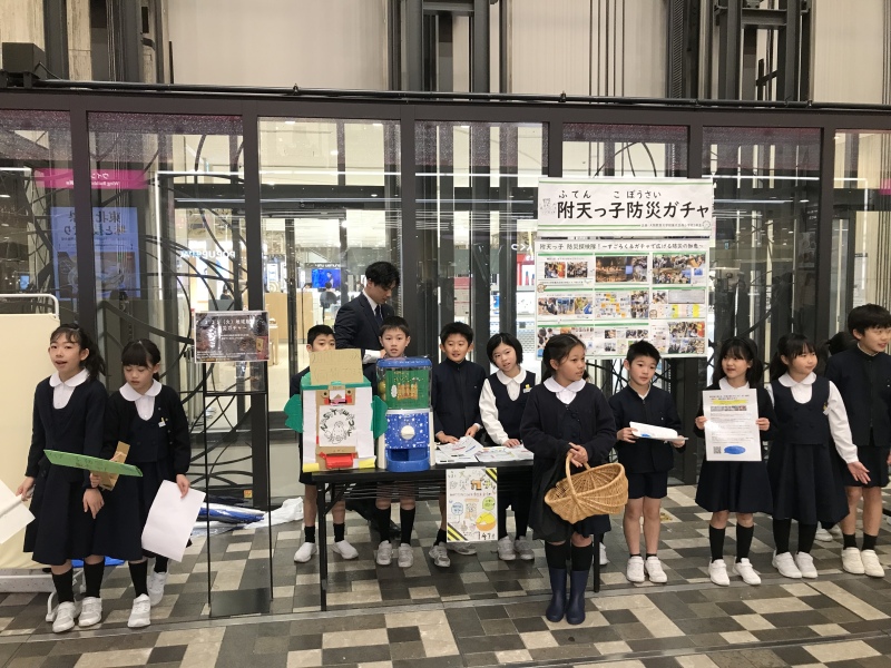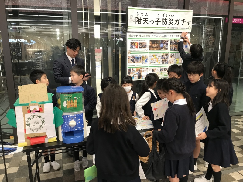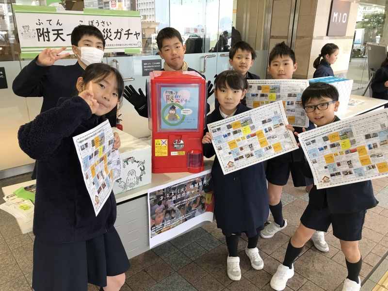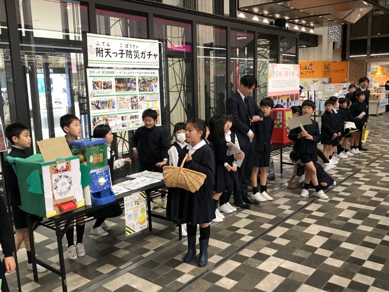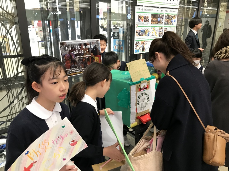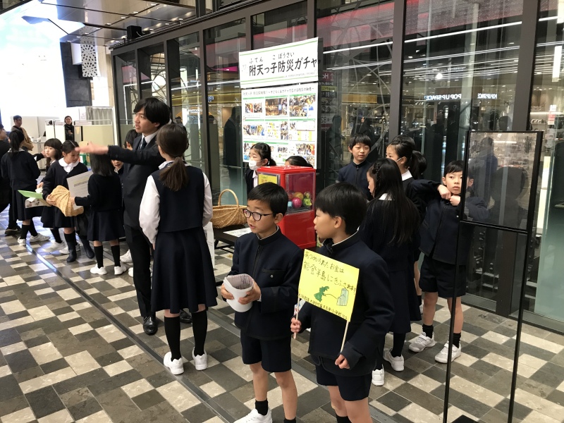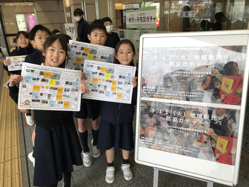 東日本大震災から14年を迎えた今日、3月11日。あべのハルカス近鉄本店2階ウエルカムガレリアと天王寺ミオ1階公園口で大阪教育大学附属天王寺小学校生による「附天防災ガチャ」イベントが開催されました。防災に関するグッズの入った「ガチャ」は1回200円。売上の一部は能登半島地震被害の支援金とすることになっている。