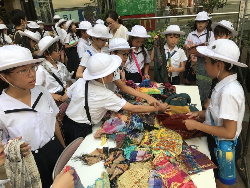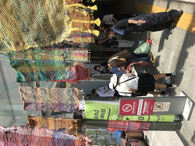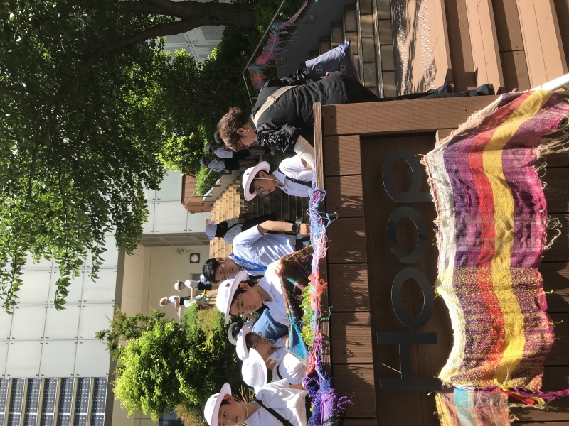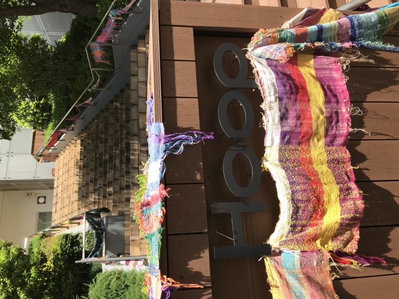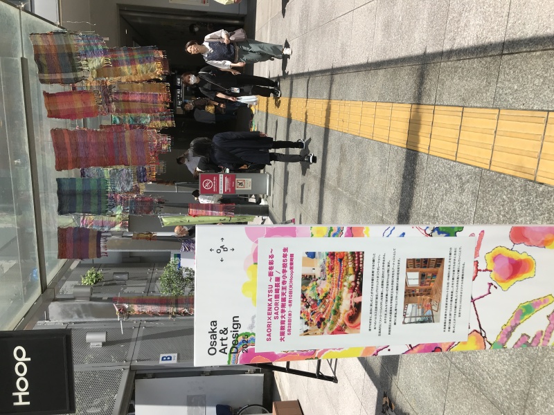 結果は、、、 色とりどりの「さをり」の布が、Hoopを鮮やかにあたたかく包んで何とも素敵な空間に!!運動場でみんなで織って、しっかり考えて素敵に巻きつけてくれた大阪教育大学附属天王寺小学校5年生のみんな。百貨店に設置した「ストリートさをり」で織り繋いでくださったお客さま。
