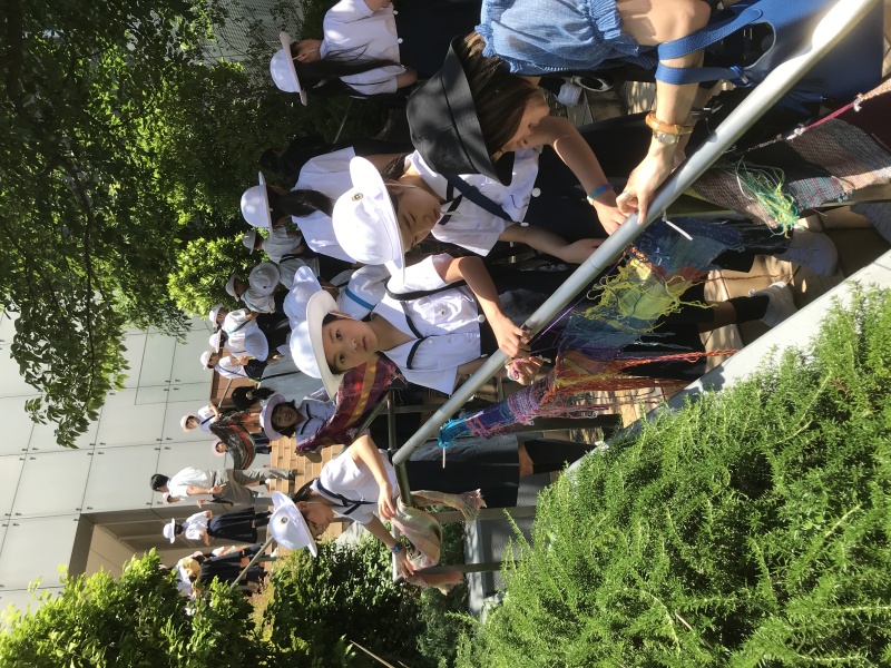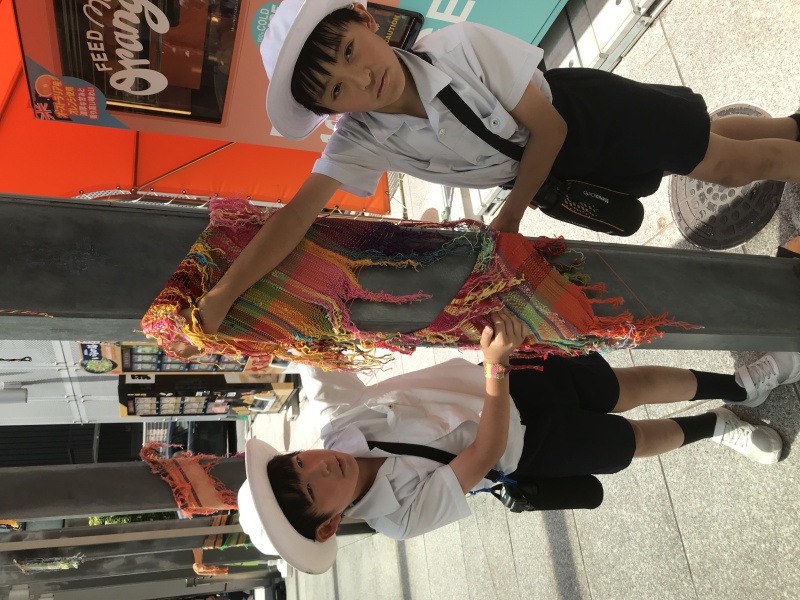 「ぼくたちは看板に飾り付けをしました。班のみんなで協力したので思っていたよりキレイに飾り付けすることができました。いつも行っているhoopが見違えるようになって嬉しかったです。家族のみんなや街の人、観光客の人たちに喜んでもらいたいです。」「僕は今日のOADがなかなかうまくいきませんでした。まずSAORI織りしたものを巻くのは大変で、巻きつけるところを見つけるのも大変でした。今回のヤーンボミングでわかったことは、自分たちの視点じゃなくて、見る人の視点で考えたらいいということを学びました。」「今日の活動で、織り物をどこに巻くか、たくさん考えました。上から見てみたり、他の物と比べたりして考えました。こんな経験はなかなか出来ないと思うので、家でも編み物をしてみたり、そういう気分になってやってみたいと思いました。」
