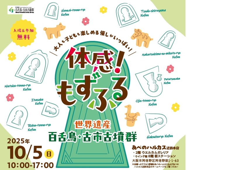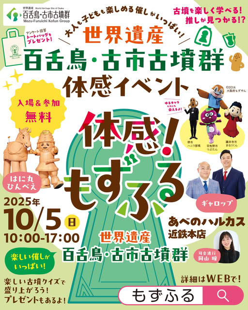 10月5日(日) 10:00~17:00 あべのハルカス近鉄本店 2階ウエルカムガレリア とウイング館8階街ステーション で世界遺産「百舌鳥・古市古墳群」を体感できるイベント「体感!もずふる」が開催されます。
