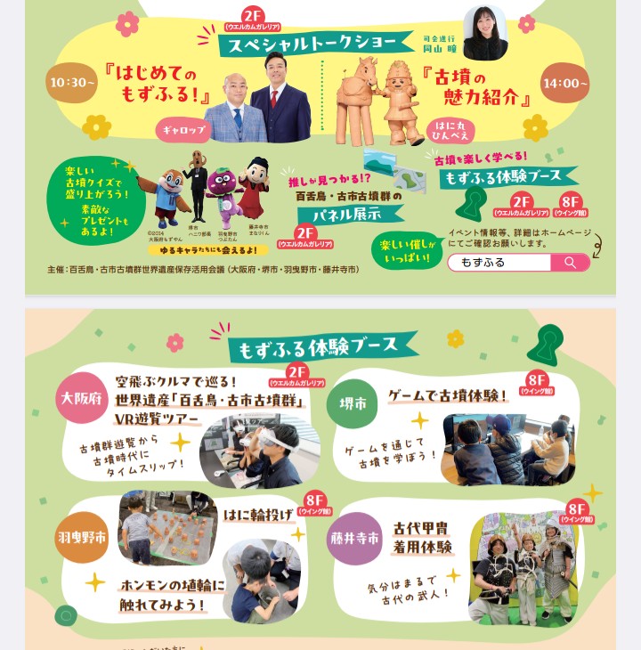 古墳群のパネル展示や古墳を楽しく学べる「もずふる体験コース」、漫才コンビ「ギャロップ」や「はにまる・ひんべえ」のトークショー。8階ウイング館「街ステーション」 ゲームではゲームで古墳体験、触れる実物埴輪展示、はに輪投げ、古代甲冑の着用体験、遊覧ツアーVR体験など盛りだくさん。大人も子供も楽しめるイベントです。