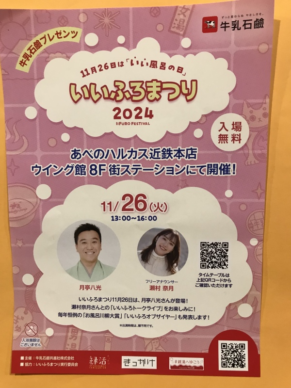 11月26日は「いい風呂の日」。あべのハルカス近鉄本店7階「街ステーション」では「いいふろまつり」が開催されています。主催は「牛乳石鹸共進社株式会社」。