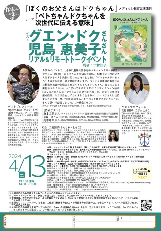 ベトナム戦争時に散布された枯葉剤被害の象徴とされたベトちゃんとドクちゃん。かつて日本の支援を受け、今では自立してたくましく生きるドクさんの人生にスポットを当て、“ベトちゃんドクちゃん”を次世代に語り継ぐ意味を考えます。映画「ドクちゃん フジとサクラにつなぐ愛」の特別試写会で来日するドクさんをお招きし、4月13日(土)にトークイベントを行います。ドクさん本人の話を直接聴ける機会です。