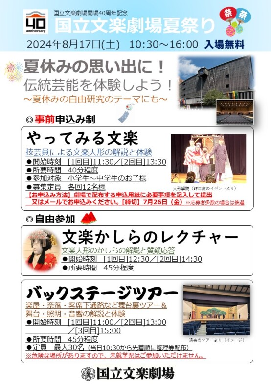 8月17日の土曜日に国立文楽劇場で夏祭りが開催されます。入場は無料(「やってみる文楽」のみ事前申込みが必要)。人形のかしら(顔・頭)もレクチャーやバックステージのツアーもあります。夏休みの自由研究にもおすすめ。