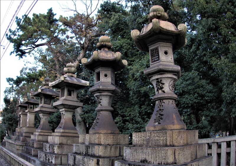境内に600基以上もある石灯篭も人々の思いが込められたものです(写真下)。荒波を越えて各地に繁栄をもたらした北前船の人たちを中心に、さまざまな業界の人が「航海の神」である住吉さんに安全を祈願し寄進しました。なかには12m近くに及ぶものもあります。この石灯籠群は「荒波を越えた男たちの夢が紡いだ異空間~北前船寄港地・船主集落~」として日本遺産にも認定されています。