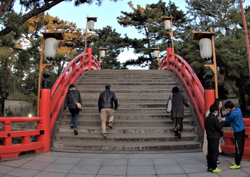 大阪生まれのノーベル賞作家・川端康成は、幼いころに両親を亡くし孤独な心を抱えていました。その彼が幼心に覚えているのが母に手を引かれて反橋(太鼓橋。写真上)を渡った情景。そして短編『反橋』に次の一節を書き加えたのでした。