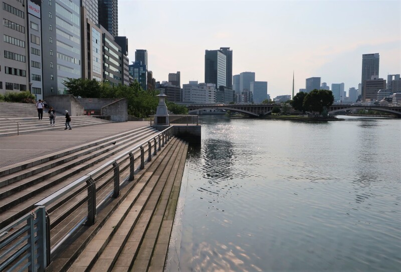 昭和に入って浜は埋め立てられて道路となり、いまは土佐堀通沿いに碑が建つのみです(写真下)。しかし、平成になって大川沿いに桟橋が整備され、水上バスや遊覧船が接岸できるようになりました。新たな「八軒家浜」から天神橋に続く遊歩道は、いまや絶好のデートスポットでもあります。志士たちが見た景色とは様変わりですが、それでも川面と船着場から見える風景が人々の心を和ませてくれるところは、幕末もいまも、そして100年後もきっと変わらないことでしょう。