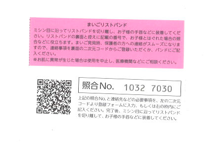 好きな色のリストバンドを選び、娘の腕に巻いていくれている間に、親は、携帯でQRコードを読み込み、バンドの「照合No.」と氏名、子どもの名前、自分の携帯番号を登録します。