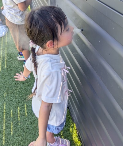 ほかの場所では暑さに耐えて待つところを、ここならミストが噴き出る穴の前を、それぞれひとつずつキープして、涼し気に子どもたちを待っていました。
