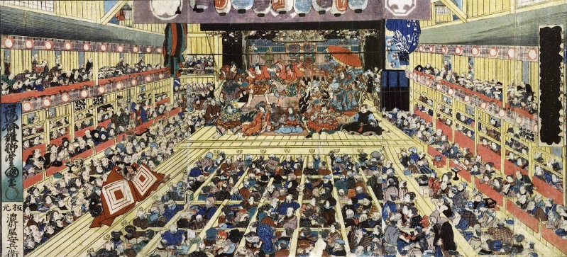 上方は「和事(わごと)」と言って、男女の情愛を描いた物語、江戸は「荒事(あらごと)」と称する武士を主人公とする演目が中心になった。花道や回り舞台なども考案され、老いも若きも、歌舞伎見物が生活の一部になっていった。