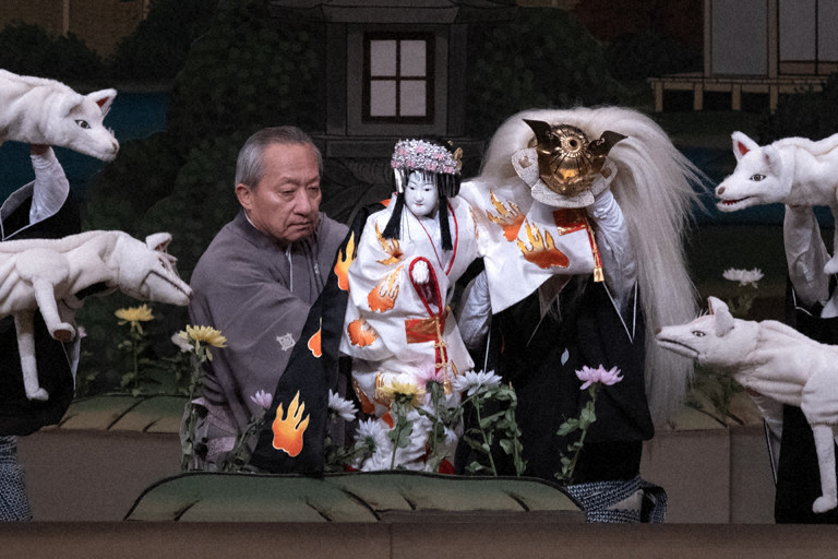 見どころは、なんといっても「奥庭狐火の段」の白狐登場のシーンでしょう(写真はその一場面)。人形の動きがリアルなだけでなく、とても幻想的。ここは三味線の聴き所でもあり、糸をこすったり指で弦をはじいたりして、狐の足の動きや鳴き声を表現するんです。まるで、ミュージカルを見ているような感覚で楽しめました。