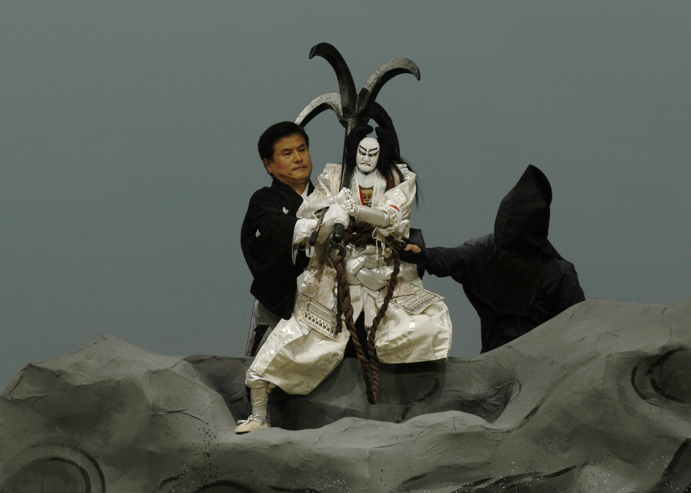 最後の人形遣いは三人一組で動かします。頭と右手を担当するのが「主遣い」。チームのリーダーです。残りの2人は「左遣い」と「足遣い」で、左遣いは「差し金」を使って操作します。主遣いの微妙な動きから、左遣いと足遣いは即座に何をすべきかを判断します。その連携プレーはほんと見事です。