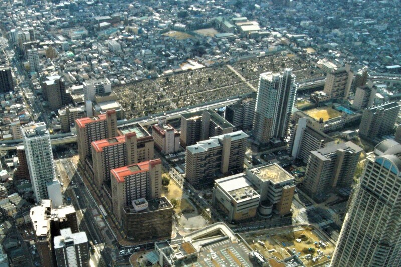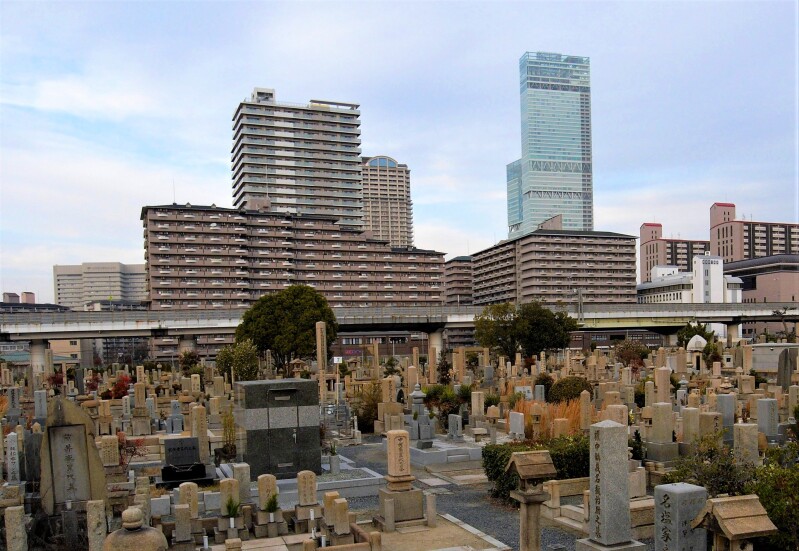 阿倍野墓地は総面積6.2ha、墓碑の数1万4000。その規模がいかに「広大か」はあべのハルカスの展望台から見れば一目瞭然です。南側の下に、筆箱のような細長い四角形がくっきりと浮かび上がっているのがわかるでしょう(写真下)。ぜひ、現地と「空の上」から、大阪の近代遺産とそれに連なる歴史の重みを感じて欲しいものです。