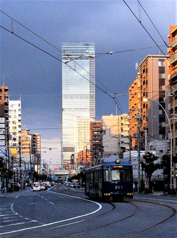 まずは「大阪と堺を結び一定の需要がある」(=利便性がよい)からでしょうが、それ以上に、大阪市南部の風景に溶け込んでいること、人々と同じ高さの目線で街を眺められることなどが「どうにも愛おしく」感じさせるように思えます。場所によっては、写真下のような新旧合わさった景色を見ることもできる。レトロやノスタルジックだけではない、「独自の存在感」が人々を魅きつけるのではないでしょうか。