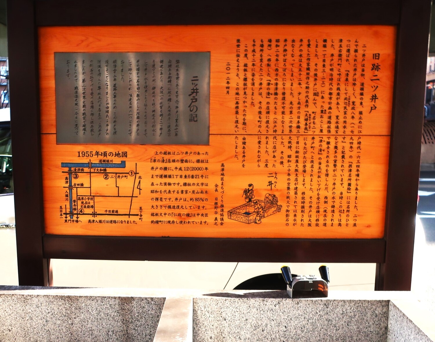 見過ごされがちですが、劇場前に「二つ井戸」のモニュメントがあります(写真下)。並んで掘られた2つの井戸は珍しく、『摂津名所図会』や織田作之助の『夫婦善哉』にも登場する名所でした。本来の場所は100メートルほど北で、昭和の終わりまであたりは二ツ井戸町と呼ばれていたそうです。そうした趣ある町名は、できれば残して欲しかったですね。