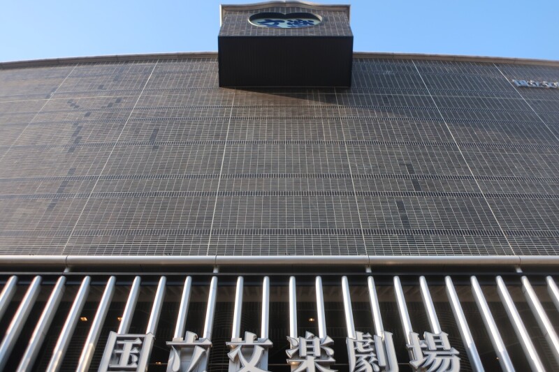 そんな文楽の拠点が国立文楽劇場です(写真上)。設計は世界的建築家・黒川紀章で、1984(昭和59)年に完成しました。黒の格子模様を基調にした伝統的な和風のデザイン。正面の中央上部には櫓を模したでっぱりがあり、他にも竹矢来、唐破風などを昔の劇場を彷彿する意匠がそこここで見られます。林立する銀の柱は、近松作品などに登場する遊郭の格子をイメージしているのでしょうか。