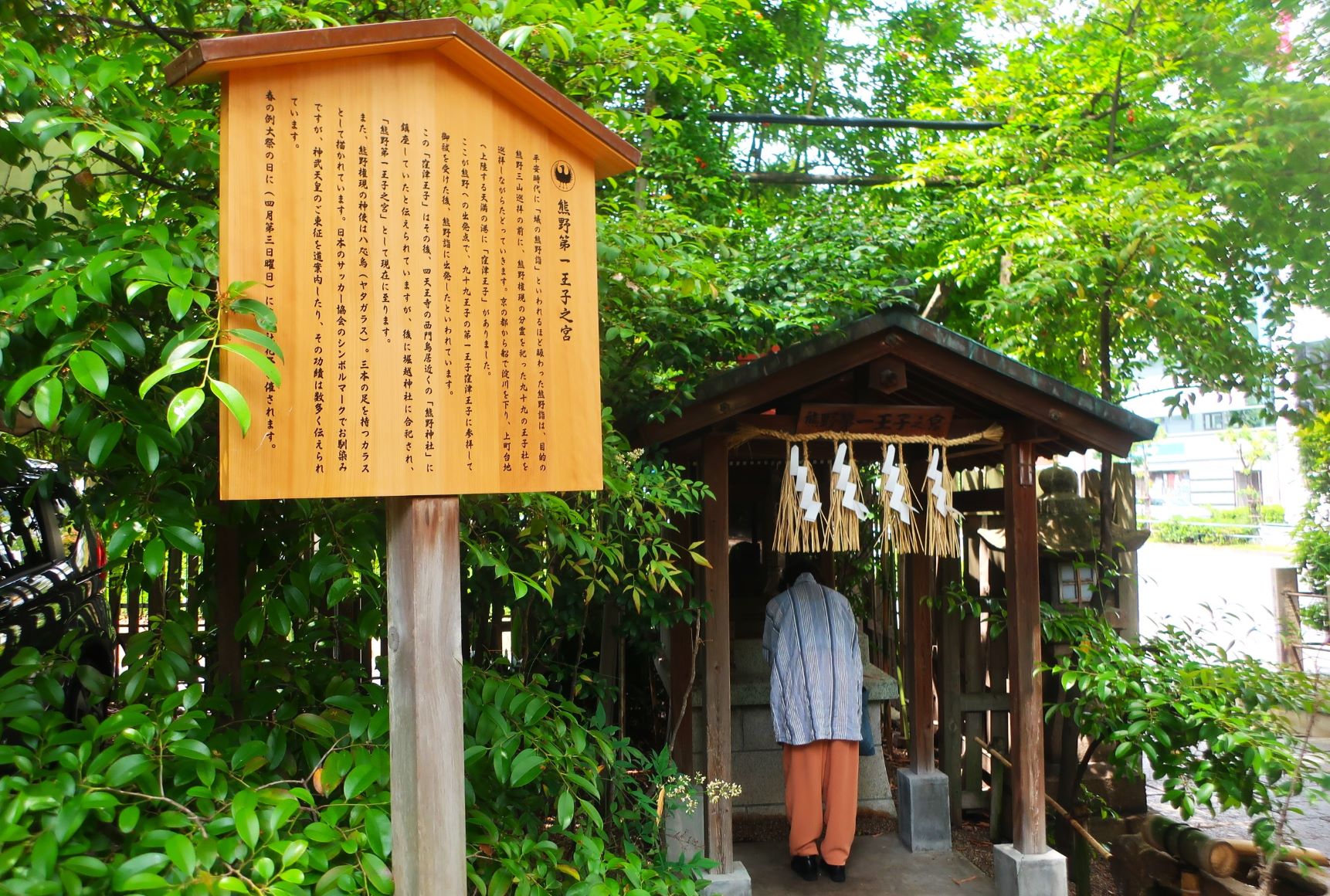 境内には熊野第一皇子之宮が建ちます(写真下)。熊野街道の起点である(いまの坐摩神社行宮)にあった窪津王子が四天王寺の西門近くの熊野神社に移り、熊野神社が堀越神社に合祀されたのを機に現在の場所に移転しました。また、徳川家康が篤く信仰したという茶臼山稲荷神社も末社に連なります。夏の陣の際、稲荷社の白狐が家康の危機を救ったとされ、交代の度に大坂城代も参ったそう。小さいながらも実にいろいろな歴史を、堀越神社は秘めています。