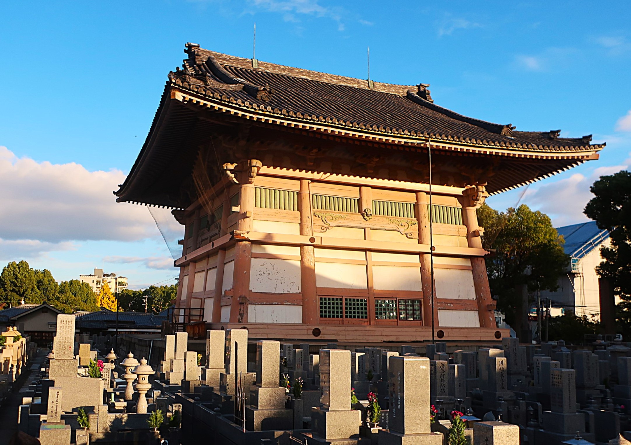 写真上は西門近くにある総本家釣鐘屋の店舗。実に赴きがありますね。大阪市の都市景観資源にも登録されているそうです。屋根の上に“ミニチュア版‘’の鐘楼が乗り、2階に見える4つの窓も寺院建築によくある花頭窓(かとうまど)に似せた釣鐘の形。多くの人がカメラを構えるのもわかります。