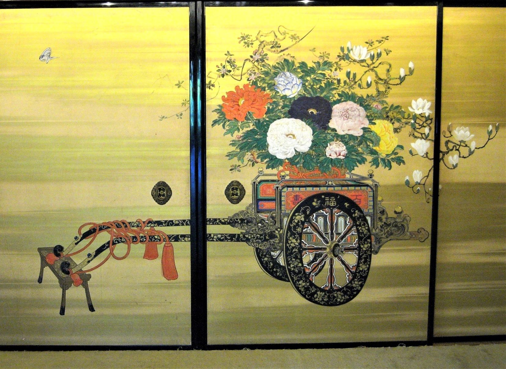 敷地は約1300坪もあり、広い庭は昆虫や野鳥の楽園のようになっています。その庭を囲むように、御殿、新御殿、月見台などが並びます。広間は折上格天井に付書院、床脇を有するなど豪華なつくり。建具や調度品も見事で、写真下のような襖を見ることができます。大正10(1921)年の火災で一部焼失しましたが、昭和7(1932)年に復興。新御殿、月見台などはその際に建てられたものですが、それらを含め多くの建物が国の登録有形文化財に指定されています。