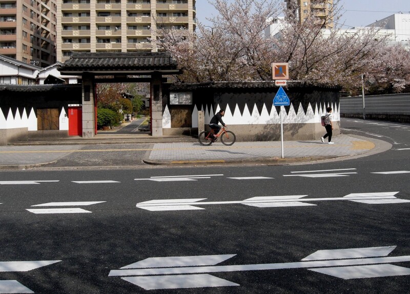 とはいえ、赤穂事件と大坂が無関係だったわけではありません。ゆかりの場所は各地に残り、吉祥寺(写真上)もその一つ。境内には浅野内匠頭長矩や義士たちの墓が並ぶほか、大石内蔵助の座像や四十七士の石像まであって、境内はまさに「忠臣蔵」一色。山門横の築地塀まで黒白の段だら模様にデザインされています。
