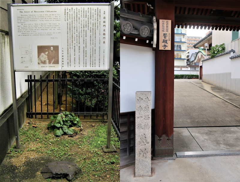さらに東へ進み、上町筋沿いの誓願寺にあるのが井原西鶴の墓です(写真上の右。中央区上本町西4-1)。西鶴の墓は長らく所在が不明でしたが、明治の文豪・幸田露伴が無縁墓の中から偶然発見したと伝わります。現在では、西鶴の命日にあたる毎年9月に「西鶴忌」が営まれ、講演会なども行われています。