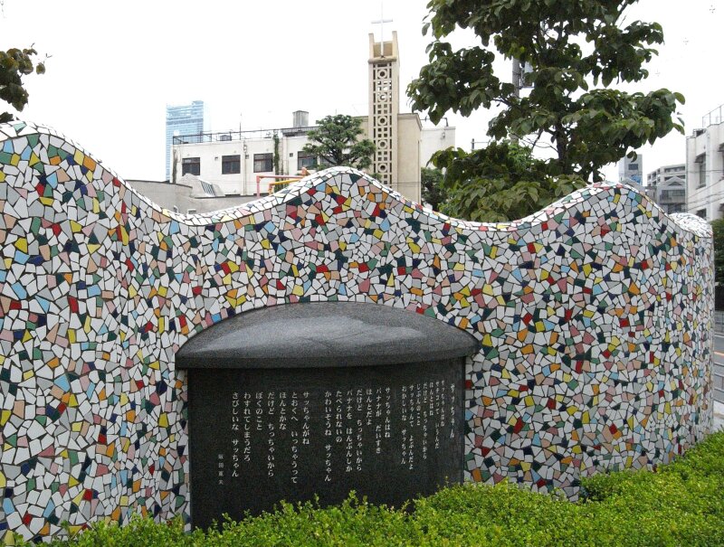 また、この教会が運営し隣接する幼稚園の敷地には、ある有名な童謡の歌碑があります。歌の名前は『サッちゃん』(写真下)。作者の阪田寛夫(『土の器』で芥川賞も受賞)は園の2期生で、1歳上で同じ園に通う「さちこ」という女の子をモデルに書いた、と言われています。いまなお愛される歌の舞台が上町台地だったと知り、なんだかうれしくなります。