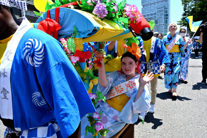 江口保夫(フォトキョイ):5年ぶりの愛染祭り光景。タイムリーにウクライナから参加の娘さん、笑顔が微笑ましいですね。背景にあべのハルカスを入れる配慮もさすがです。ウクライナ他に早くこのような笑顔が戻り、平和になってほしいですね。