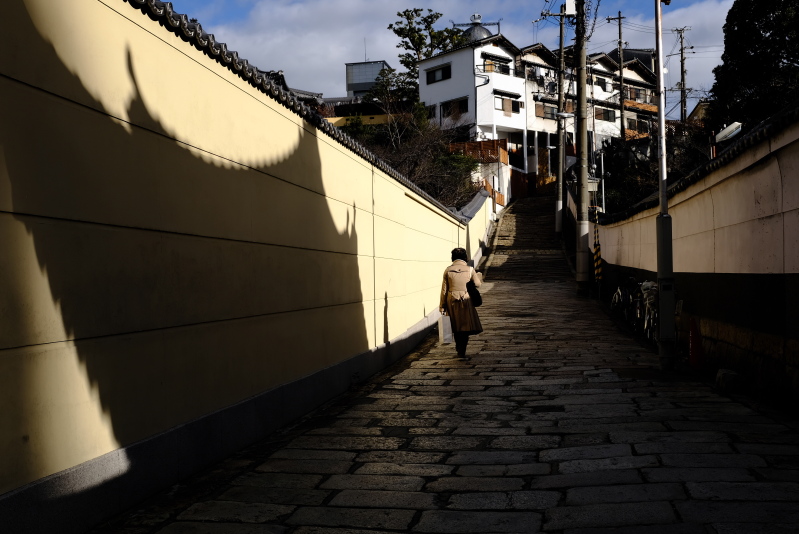冬の夕刻、源聖寺の白土塀に金台寺御堂のシルエットがくっきり。その横を家路へと急ぐ女性が足早やに通りすぎた。