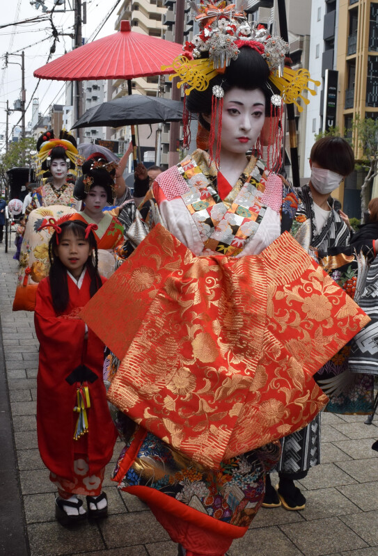 清水ミサコ(ラメカカメラ堂):被写体の表情がとても良い作品です。先頭の花魁は、きりりと真っ直ぐ前を向いていますが、他の人々にはそれぞれの眼差しがあって、奥深さを感じます。画面ギリギリで少し窮屈な印象も持ちますが、スマホで撮影される沿道の人々を上手く避けていらっしゃいますね。