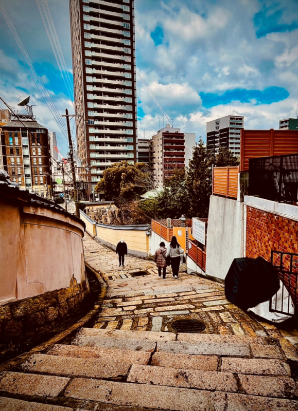 天に伸びるタワーマンションと対照的な石段。令和と昭和が混在する大阪の絵が撮りたかった。