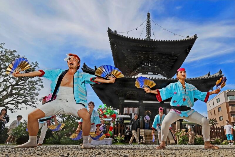 江口保夫(フォトキョイ):愛染まつりの中の雀踊りという場面だそうで、人物の位置や動き・表情、そしてローアングルから狙った点、力強さを感じます。また多宝塔の位置もばっちりですね。