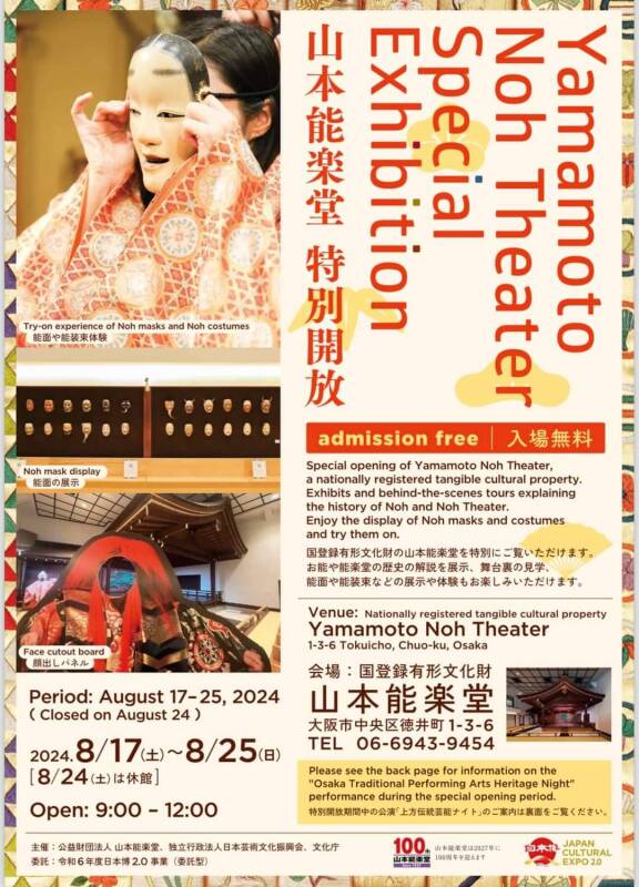山本能楽堂「特別公開」25日日曜まで Posted on 2024年8月18日2024年8月18日 by うえまちウェブ編集者 山本能楽堂のイベントのご案内です。25日の日曜日まで、特別開放を実施中。開放時間は午前9時~12時。ぜひ、ご参加を。